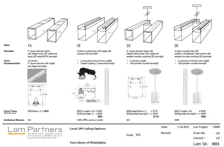 Trellis ceiling comes to life with custom direct/indirect fixtures, integrated within the existing beams of the ceiling.