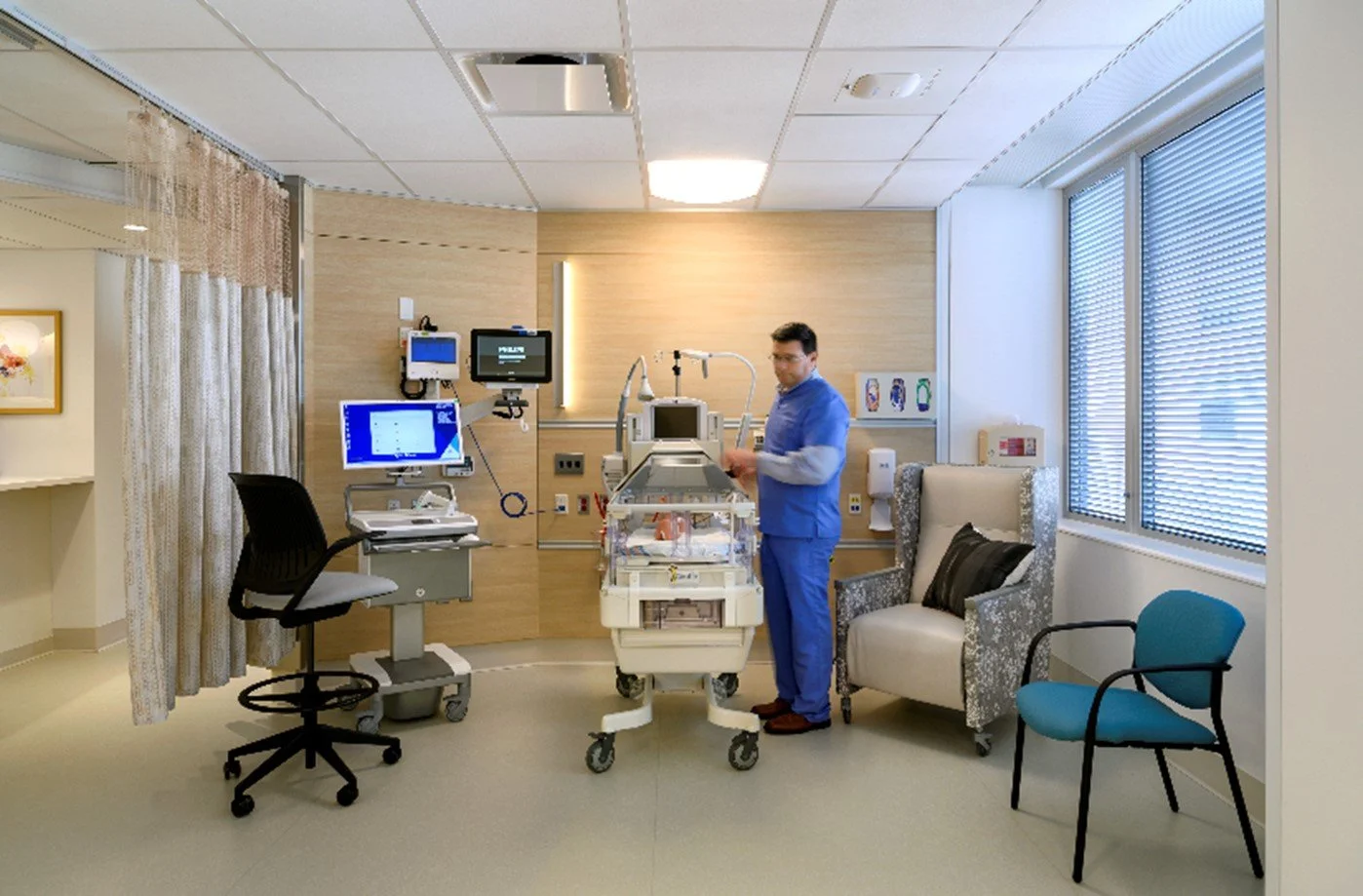These newly renovated NICU and Infusion suites, constructed for an international healthcare provider, focus on bringing hospitality design elements into highly stressful medical environments in order to improve the patient and visitor experience. The overarching goal of both suites was to give patients and loved ones a comfortable, warm environment to promote healing without clinical distraction.