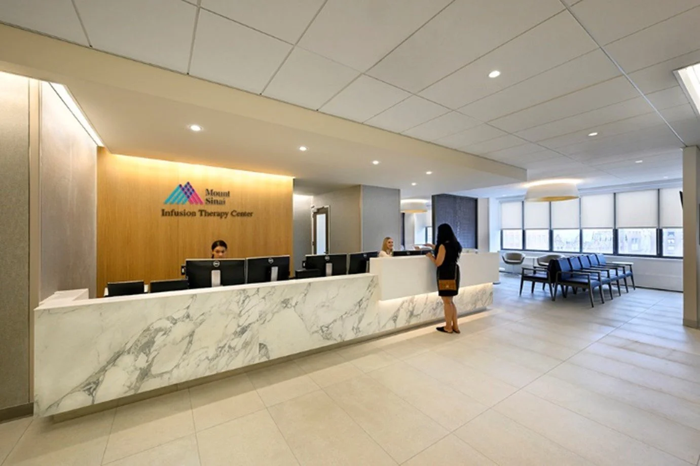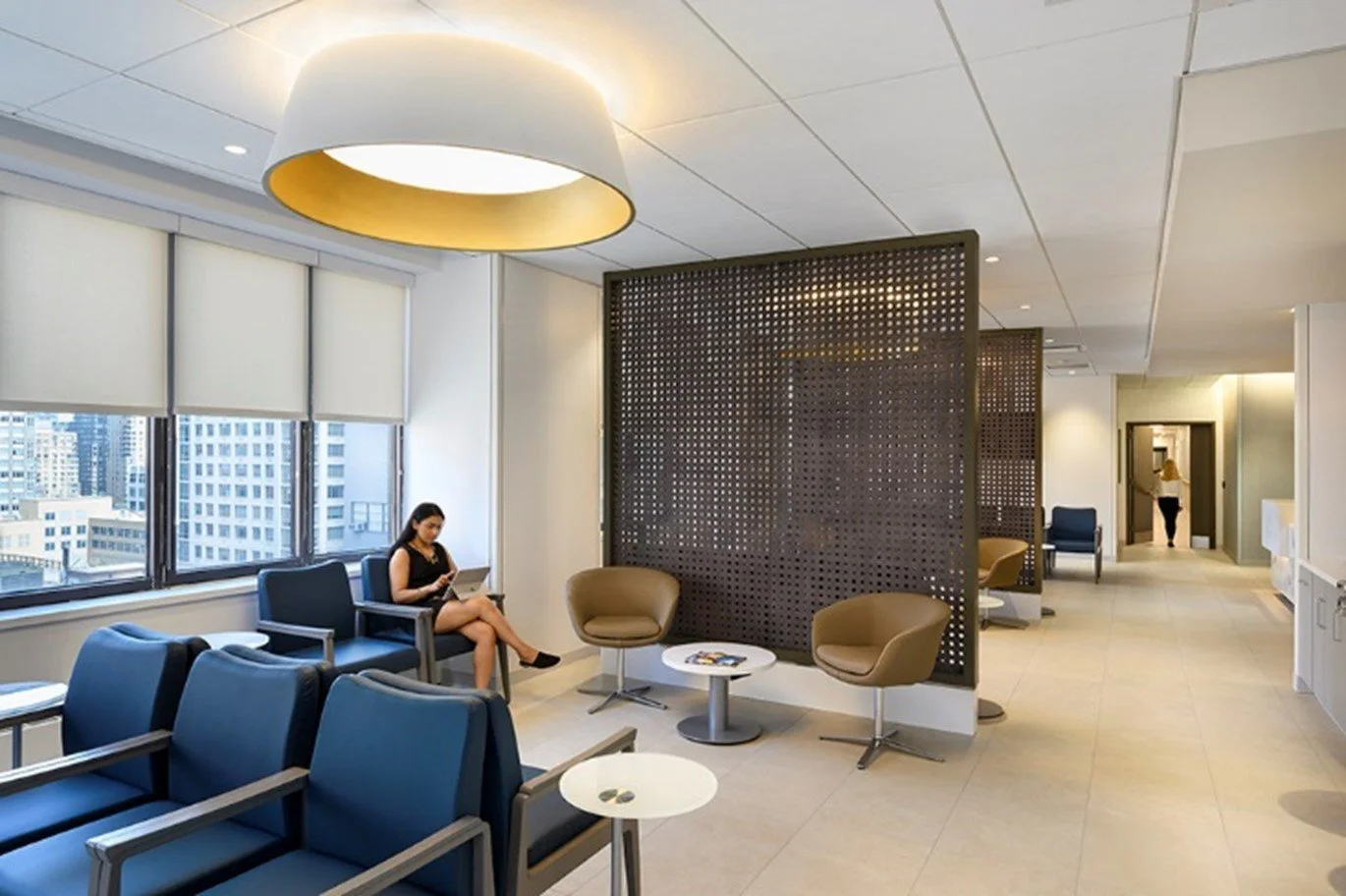 Individually dimmable, large-scale fixtures softly deliver adequate light levels for exam tasks, while allowing variable settings to satisfy patient comfort, the project’s key design driver.