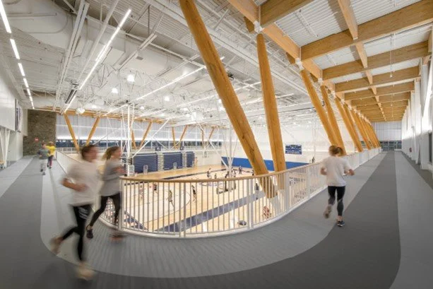 Low-glare, suspended linear direct/indirect pendants run continuously between the signature wooden structural truss system, illuminating the three-court gymnasium below and volumetrically washing the white ceiling above.